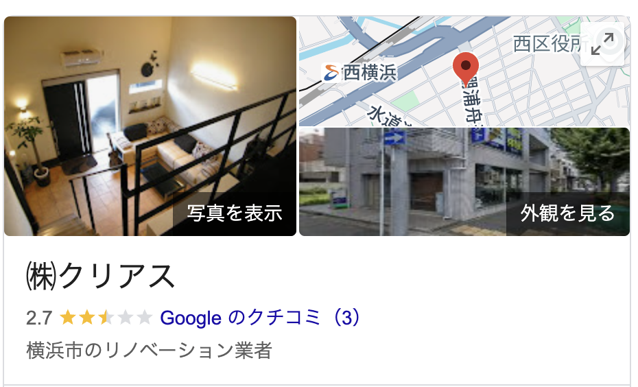 株式会社クリアスのGoogle口コミは全体的に高評価とは言えず、口コミ件数も3件と少ないです。また、注文の相違や作業のクオリティに関するトラブルには不安が残ります。。。
