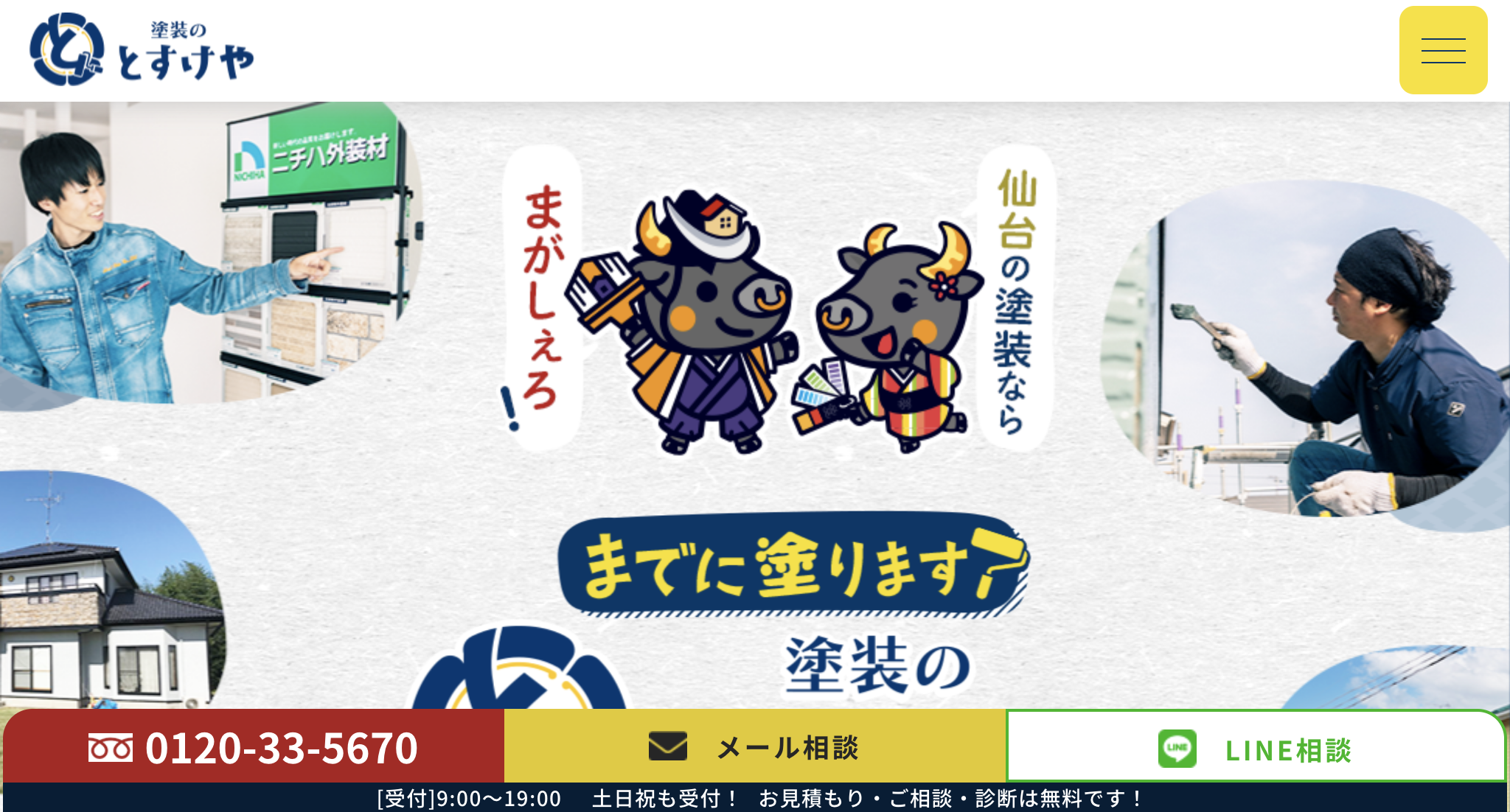 『宮城県でおすすめの外壁塗装業者ランキング10選!口コミのよい優良店のみ【2025年最新】』にて紹介しているように、 宮城県で外壁塗装・屋根修理業者で悩まれている方にはランキング1位の塗装のとすけやがおすすめです!