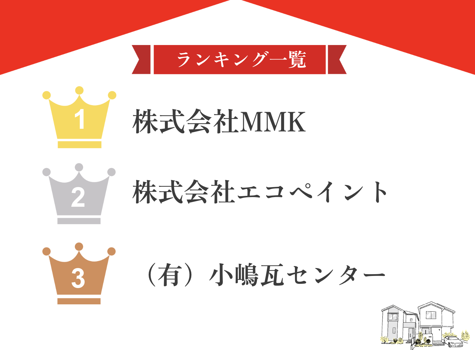 | 5位 | 株式会社小幡屋根工事 | ★★★☆☆ 3.0 | △ | △ | 〇 | 〇 |