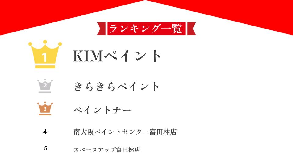 4位 | 南大阪ペイントセンター富田林店 | ★★★☆☆3.5 | 〇 | 〇 | 〇 | △ |