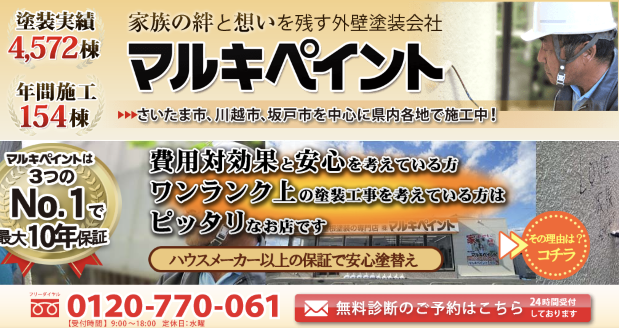埼玉県で外壁塗装業者をお探しで、「悪徳業者は避けたいけれど、どこがいいのか不安…」という方は、一度お問合せしてみてはいかがでしょうか?