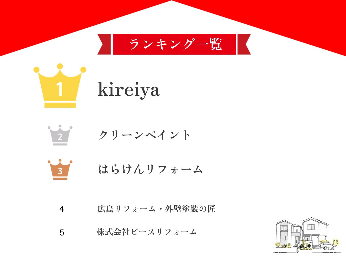 今回のランキング1位である「kireiya」は、広島市エリアで評判No.1を獲得しているおすすめの会社となっております!
