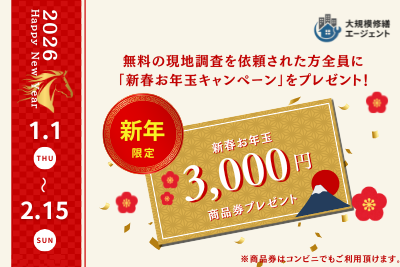 現在、大規模修繕エージェントでは新春キャンペーンとして現地調査が行われた方全員に「コンビニでも利用可能な商品券3,000円分」をプレゼントしているとのことです!(2月15日まで限定)