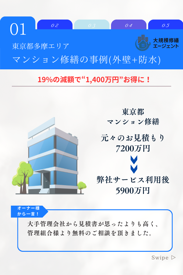 • 他社7,200万円→5,900万円(東京都のマンション修繕)※19%の減額で1,400万円お得に
